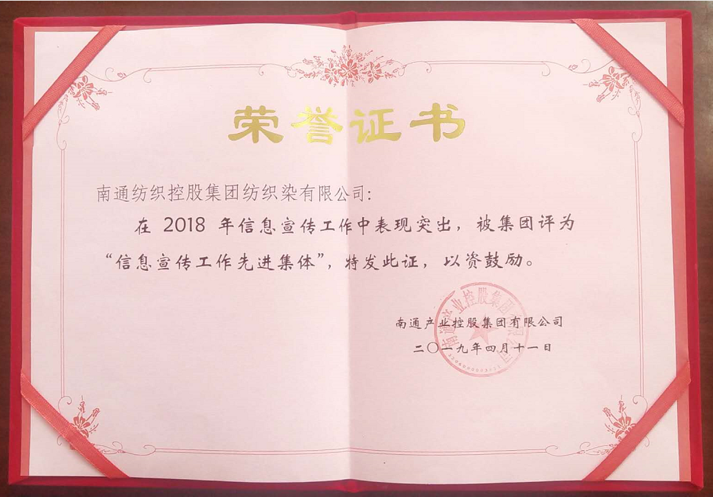 4月12日下午,產(chǎn)控集團召開了產(chǎn)控系統(tǒng)辦公室主任工作會議,會上對2018年度通訊宣傳工作,進行了表彰,南通紡織控股集團紡織染有限公司榮獲2018年度產(chǎn)控集團“信息宣傳工作先進單位”榮譽稱號。