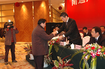 與會代表濟(jì)濟(jì)一堂 獲得效益貢獻(xiàn)獎一等獎先進(jìn)集體(左起:碳素、江山、通科、石化) 企業(yè)代表遞交安全生產(chǎn)責(zé)任狀和黨風(fēng)廉政建設(shè)責(zé)任書 |