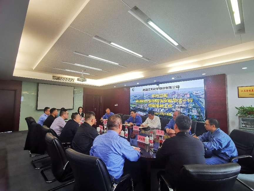 為全方位深度擰緊安全環(huán)保責任鏈條,進一步提高企業(yè)環(huán)保本質化治理能力和水平,10月18日上午,南通市公安局黨委副書記、副局長郭玉家一行來到南通江天化學股份有限公司開展工作走訪調研。江天化學黨支部書記、副總經理張永鋒、黨支部副書記、副總經理沙曉東、支部委員、副總經理任建軍等陪同調研參觀。